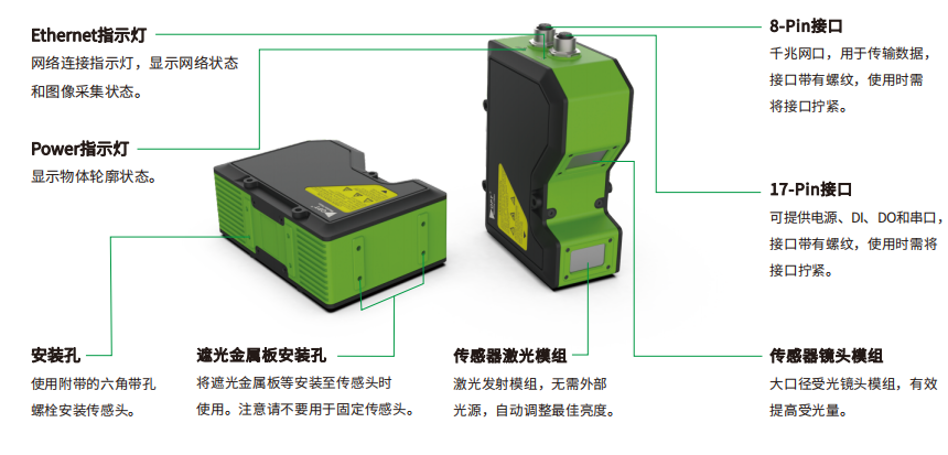 ◆3D传感器可独⽴⼯作,不需要外部控制器,⽅便系统集成,千兆以太⽹接⼝,最⼤传输距离可到100m。 ◆搭载⾼动态范围⾼速CMOS,适应不同材质、颜⾊的⽬标物并可通过压缩视野达到超⾼速的扫描速度。 ◆搭载⾃适应⾼功率蓝光激光模块,3200个有效像素点,真实还原轮廓信息。 ◆经出⼚标定,并搭配外部安装校准,极⼤提⾼了检测精度。 ◆符合GigEVisionV2.0协议、GenICam标准和EMC,ROHS认证。