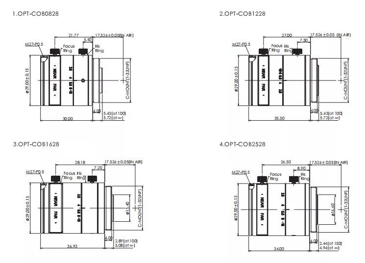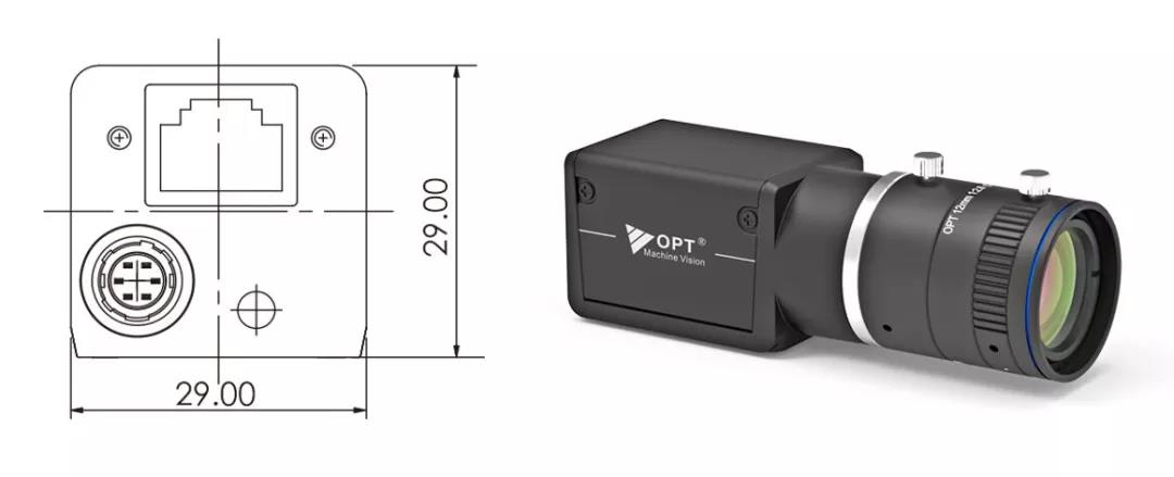 镜头外径Ø29mm,与相机尺寸兼容,镜头总长不超过42mm(OPT-COB5028镜头总长<62mm)。